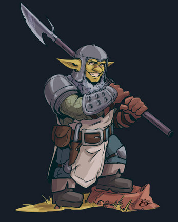He’s a gobbo fighter/mercenary. The armour he wears are an assortment of different spoils from battles. He doesn’t belong to a specific merc group, usually goes with the highest bidder at the time after evaluating his odds.